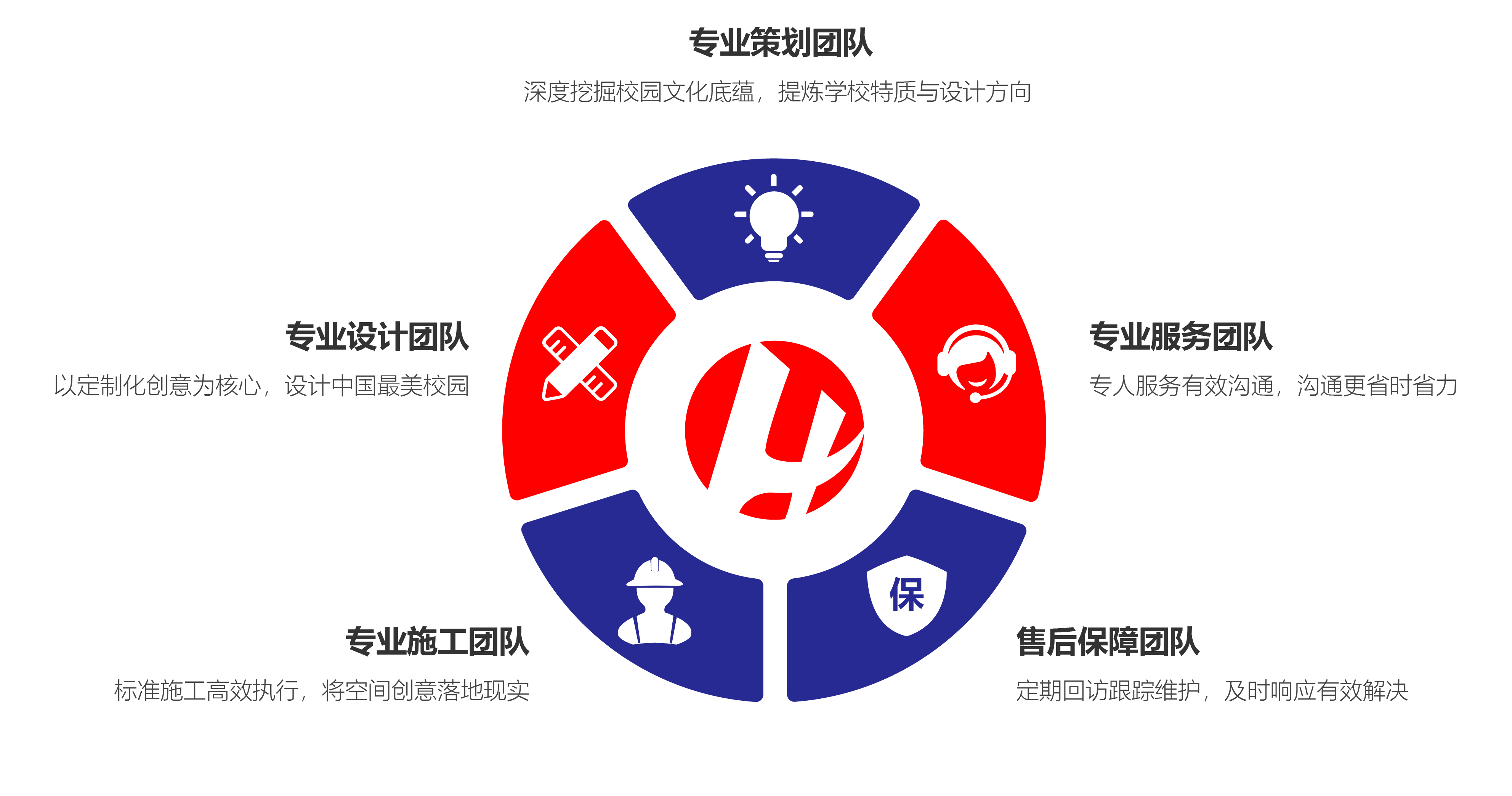 我们拥有精英设计团队,以定制化创意设计为核心,以全新的校园文化理念为内容,结合策划部的策划方案及资料收集整理,考虑实际施工的可行性技术设计,将文化、空间、景观、科技、设计艺术跨界整合,完成独具创新的校园品牌文化设计。
